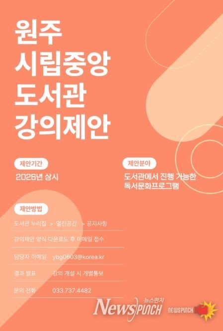 뉴스펀치 조평훈 기자 | 원주시립중앙도서관은 다양한 프로그램을 시민들에게 제공하기 위해 강의 제안을 상시 운영한다.
