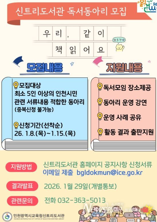 뉴스펀치 정홍균 기자 | 인천광역시교육청신트리도서관은 시민 주도의 자율적인 독서 활동을 지원하고 생활 속 독서문화를 확산하기 위해 '2026년 자율독서동아리 지원사업'의 동아리를 모집한다.