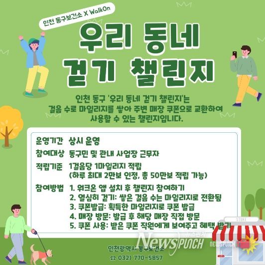 뉴스펀치 정홍균 기자 | 인천 동구는 전국 최초로 선보인 모바일 기반 참여형 건강증진 사업 ‘우리 동네 걷기 챌린지’를 성황리 운영 중이라고 밝혔다.