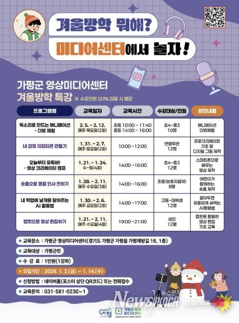 가평군 영상미디어센터 관계자는 “겨울방학을 맞은 학생들이 영상미디어와 AI를 직접 체험하며 미래 역량을 키울 수 있도록 프로그램을 구성했다”며 “지난해 가평에 문을 연 영상미디어센터가 방학 기간 지역 학생들에게 유익한 배움의 공간으로 자리 잡길 기대한다”고 말했다.
