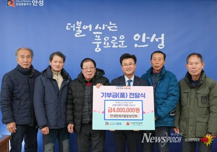 뉴스펀치 박상훈 기자 | 안성시는 1월 8일 민속오일장 상인회로부터 400만 원의 성금을 전달받았다고 밝혔다. 전달식에는 상인회 임원진과 시 관계자가 참석한 가운데 진행됐다.