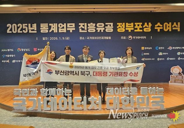 뉴스펀치 김윤걸 기자 | 부산 북구는 국가데이터처(옛 통계청)가 주관하는 ‘2025년 통계업무 진흥유공’에서 국가 통계 발전에 기여한 공로를 인정받아 대통령 기관 표창을 수상했다고 9일 밝혔다.