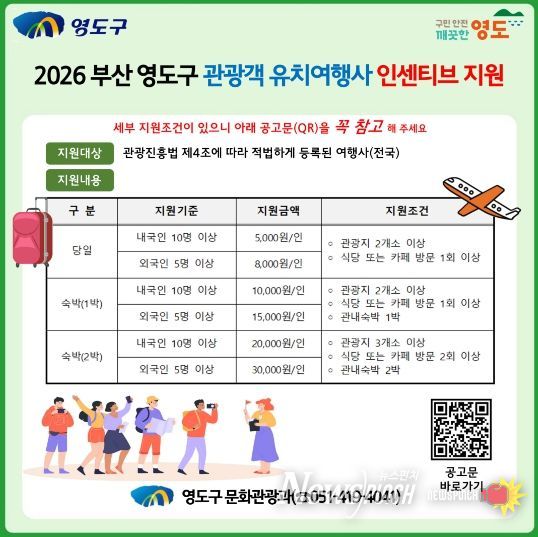 뉴스펀치 김윤걸 기자 | 부산광역시 영도구는 관광객 유입 확대와 체류형 관광 활성화를 위해 '2026년 관광객 유치 여행사 인센티브 지원 사업'을 추진한다고 밝혔다.