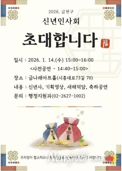 뉴스펀치 박상훈 기자 | 금천구는 오는 14일 오후 3시 금나래아트홀에서 병오년(丙午年, 붉은 말의 해) 새해를 맞아 금천의 도약과 번영을 기원하는 ‘2026년 금천구 신년인사회’를 개최한다고 밝혔다.