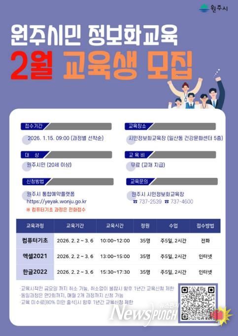뉴스펀치 조평훈 기자 | 원주시는 시민들의 디지털 활용 능력 향상과 정보 격차 해소를 위해 시민정보화교육 2월 수강생을 모집한다.