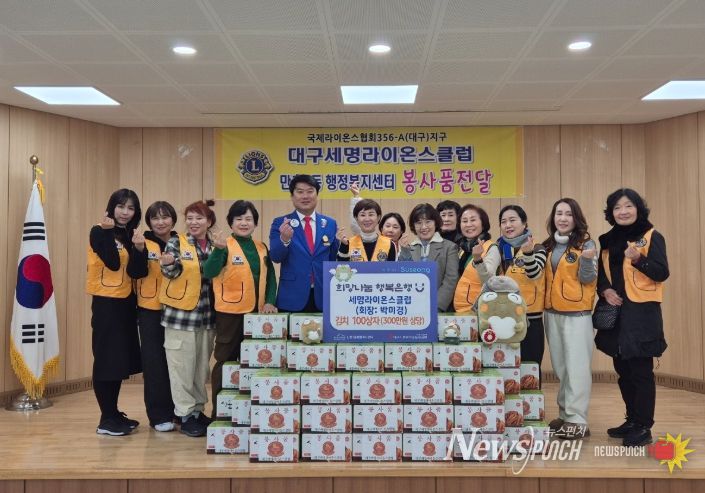 뉴스펀치 조평훈 기자 | 대구 세명라이온스클럽(회장 박미경)은 만촌1동 행정복지센터를 방문해 김치 3kg 100상자(300만 원 상당)를 후원하며 지역 이웃을 위한 따뜻한 나눔을 실천했다.
