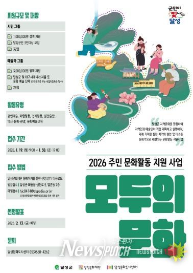 뉴스펀치 조평훈 기자 | (재)달성문화재단 달성문화도시센터는 오는 30일까지 지역 주민과 예술가들의 문화활동 지원 사업 ‘모두의 문화’에 참여할 단체를 모집한다고 12일 밝혔다.