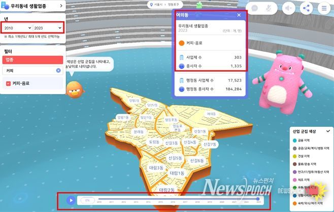 이번 서비스의 핵심 기능 중 하나는 2010~2023년 사업체 조사 데이터를 활용해 서울 전역 산업구조 변화와 흐름을 입체적으로 볼 수 있도록 ‘행정동 단위 산업․상권 변화’를 3차원 시각화한 기능이다. 특정 자치구나 행정동을 선택해 2010년 이후 어떤 산업이 성장하거나 쇠퇴했는지를 시간 흐름에 따라 확인할 수 있다.