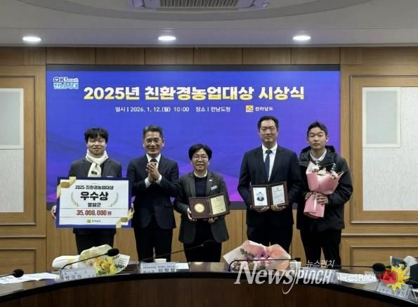 뉴스펀치 김용희 기자 | 영암군이 12일 전라남도의 ‘2025년 친환경농업대상 시상식’에서 우수상과 함께 상사업비 3,500만원, 포상금 150만원을 받았다.