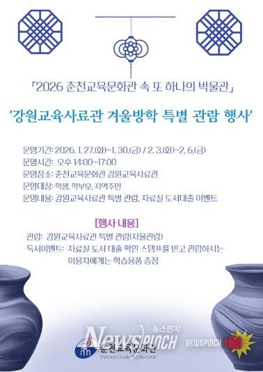 뉴스펀치 조평훈 기자 | 춘천교육문화관(관장 유선종)은 2026년 1월 27일부터 2월 6일까지 겨울방학을 맞아 학생, 학부모, 지역주민이 함께 참여할 수 있는 ‘강원교육사료관 특별 개관’ 행사를 운영한다.