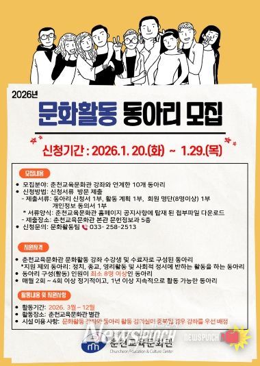 뉴스펀치 조평훈 기자 | 춘천교육문화관(유선종 관장)은 2월 10일부터 2월 13일까지 춘천 관내 유아, 초등학생, 중학생을 대상으로 2026년 겨울방학 문화활동 프로그램을 운영한다.