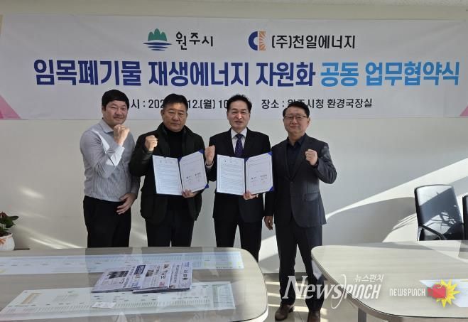 뉴스펀치 조평훈 기자 | 원주시는 지난 12일 시청에서 ㈜천일에너지와 ‘임목폐기물 무상처리 업무협약’을 체결하고, 관내에서 발생하는 임목폐기물을 친환경 재생에너지로 전환하는 데 협력하기로 했다.