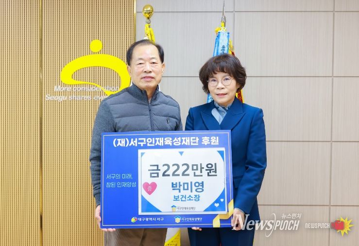 뉴스펀치 조평훈 기자 | 대구 서구청은 보건소 박미영 보건소장이 퇴임을 앞두고 지역 인재 육성을 위해 서구 인재육성재단에 222만 원을 기탁했다고 밝혔다.