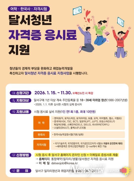 뉴스펀치 조평훈 기자 | 대구 달서구는 미취업 청년의 경제적 부담을 완화하고 취업 역량 강화를 지원하기 위해 ‘2026년 달서청년 자격증 응시료 지원사업’을 추진하고, 1월 15일부터 신청 접수를 시작한다.