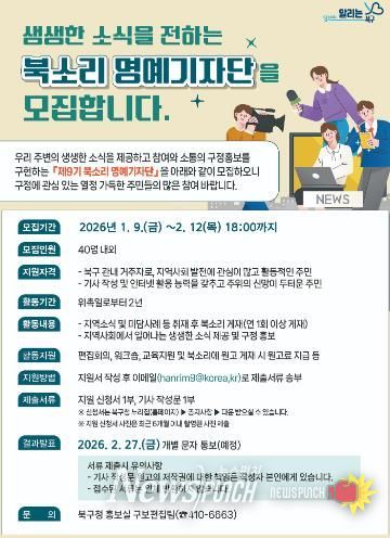 문인 북구청장은 “북소리 명예기자단은 주민이 직접 지역의 변화와 일상을 전하는 메신저인 만큼 이번 모집에 많은 관심과 참여를 바란다”며 “앞으로도 북소리가 주민과 행정의 소통 창구 역할을 할 수 있도록 다양한 지원을 아끼지 않겠다”고 말했다.