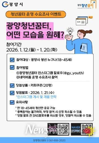 뉴스펀치 김용희 기자 | 광양청년꿈터가 1월 12일부터 20일까지 ‘광양청년꿈터, 어떤 모습을 원해?’를 주제로 2026년 청년꿈터 운영을 위한 프로그램 수요조사 이벤트를 진행한다.