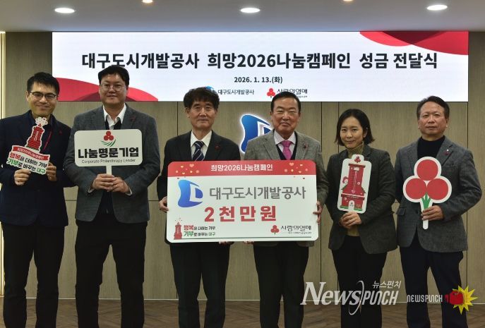 뉴스펀치 조평훈 기자 | 대구도시개발공사는 1월 13일 사회복지공동모금회가 주관하는 ‘희망2026나눔캠페인’에 성금 2,000만 원을 기탁했다고 밝혔다.