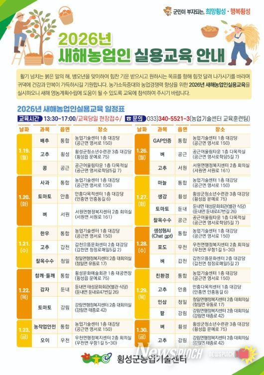 뉴스펀치 조평훈 기자 | 횡성군이 지역 농업인들의 성공적인 영농 계획 수립과 농업 경쟁력 강화를 위해 오는 1월 19일부터 30일까지 ‘2026년 새해 농업인 실용교육’을 실시한다.