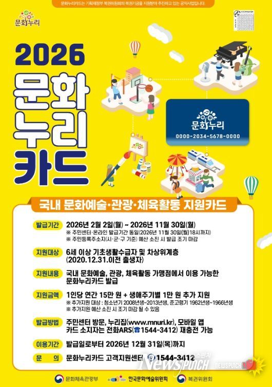 문화누리카드는 6세 이상 기초생활수급자와 차상위계층을 대상으로 문화예술·관광·체육활동 분야에 사용할 수 있는 전용 카드로, 기존 1인당 연간 14만 원이던 지원금이 2026년부터 15만 원으로 인상된다.
