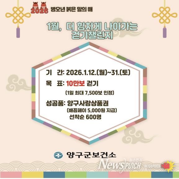 양구군은 1월부터 ‘워크온 걷기 챌린지’를 운영하며, 다양한 걷기 행사와 참여형 챌린지를 지속적으로 추진할 예정이다. 1월에는 목표 걸음 10만 보 이상, 2월부터 11월까지는 매달 목표 걸음 20만 보 이상을 걷는 주민에게 양구사랑상품권(배꼽페이) 5000원을 지급한다. 챌린지 기간 동안 하루 최대 7500보까지 인정되며 선착순 600명에게 지급한다.