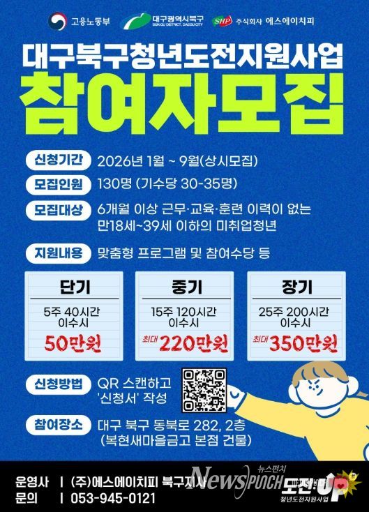 뉴스펀치 조평훈 기자 | 대구 북구청은 구직 실패와 경제적 부담 등으로 어려움을 겪는 지역 청년들의 사회 진입을 돕기 위해 '2026년 청년도전지원사업' 참여자를 모집한다고 밝혔다.