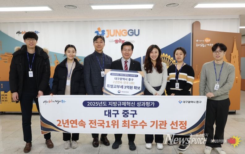 뉴스펀치 조평훈 기자 | 대구 중구는 행정안전부가 주관한 ‘2025년 지방규제혁신 성과평가’에서 2년 연속 최우수 기관으로 선정되며 규제혁신 선도 도시로서의 위상을 다시 한번 입증했다.