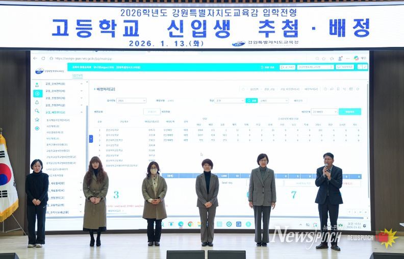 뉴스펀치 조평훈 기자 | 강원특별자치도교육청은 13일 오전 10시 30분, 본관 6층 대강당에서 ‘2026학년도 교육감입학전형(평준화) 고등학교 신입생 추첨 배정’을 실시했다.