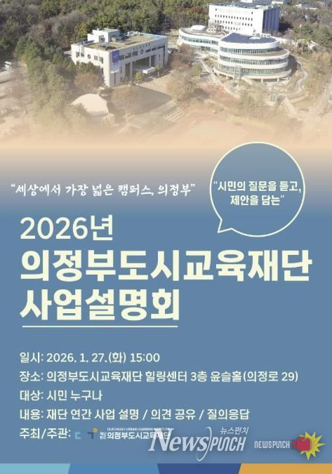 뉴스펀치 박상훈 기자 | 의정부도시교육재단은 1월 27일 오후 3시, 재단의 연간 사업 방향을 시민들과 공유하고 의견을 나누기 위한 '2026년 의정부도시교육재단 사업설명회'를 개최한다.