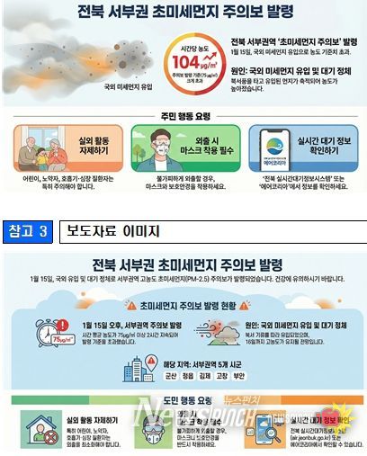 뉴스펀치 최영남 기자 | 전북특별자치도 보건환경연구원은 1월 15일 오후 국외 미세먼지 유입의 영향으로 초미세먼지(PM-2.5) 주의보를 발령했다.