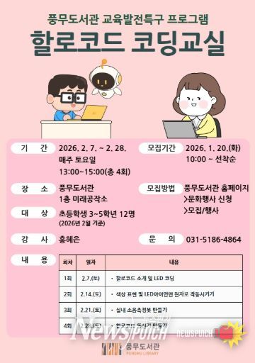 뉴스펀치 박상훈 기자 | 김포시 풍무도서관에서는 초등학생 3~5학년을 대상으로 ‘할로코드 코딩교실’을 오는 2월 7일부터 2월 28일까지 매주 토요일 오후 1시부터 3시까지 총 4회에 걸쳐 운영한다.