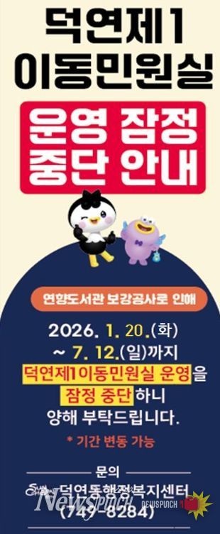 뉴스펀치 김용희 기자 | 순천시 덕연동행정복지센터는 연향도서관 내에 운영 중인 덕연동 제1이동민원실이 도서관 내진성능 보강공사 시행에 따라 오는 1월 20일부터 7월 12일까지 운영을 잠정 중단한다고 밝혔다.