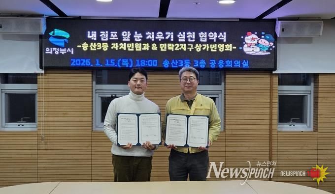 뉴스펀치 박상훈 기자 | 의정부시 송산3동행정복지센터는 1월 15일 청사 3층 공용회의실에서 민락2지구상가번영회와 ‘내 점포 앞 눈 치우기 협약’을 맺었다.