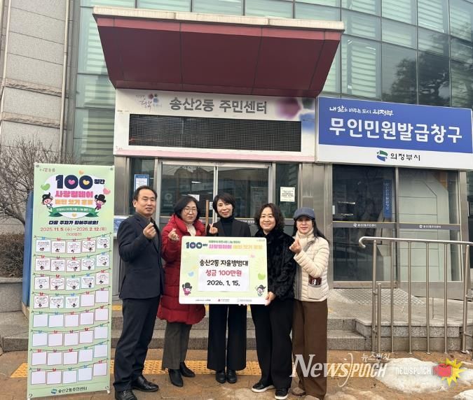 뉴스펀치 박상훈 기자 | 의정부시 송산2동주민센터는 1월 15일 송산2동 자율방범대가 ‘100일간 사랑릴레이 배턴 잇기’의 일환으로 성금 100만 원을 기탁했다고 밝혔다.