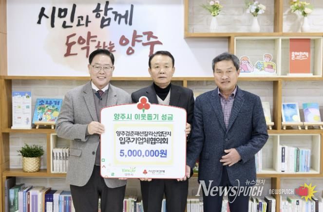 뉴스펀치 박상훈 기자 | 양주시가 지난 15일 시장실에서 양주검준패션칼라사업협동조합을 비롯한 관련 단체 및 기업으로부터 이웃돕기 성금과 성품을 기탁받았다고 밝혔다.