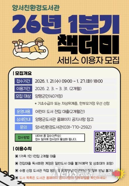 뉴스펀치 박상훈 기자 | 양평군은 오는 21일부터 27일까지 2026년 1분기 어린이 전집 대출 서비스인 ‘책더미’ 이용자를 모집한다고 밝혔다.