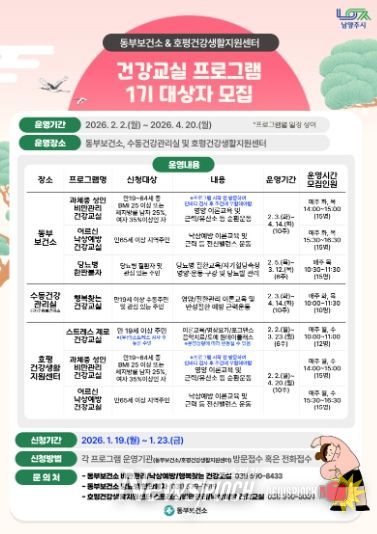 뉴스펀치 박상훈 기자 | 남양주시는 오는 1월 19일부터 23일까지 호평건강지원센터에서 ‘건강교실 프로그램’ 1기 참여자를 모집한다고 밝혔다.