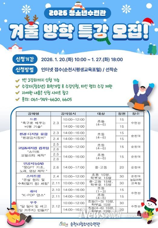 뉴스펀치 김용희 기자 | 순천시 청소년수련관에서는 겨울방학을 맞아 청소년과 가족을 대상으로 미래 핵심 역량 함양을 위한 2026년 겨울방학 특강 프로그램을 운영한다.