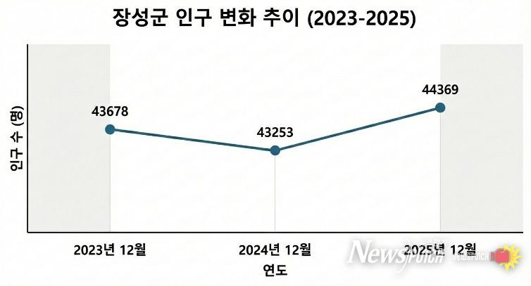 뉴스펀치 김용희 기자 | 장성군이 지방 소멸과 인구 감소 우려를 해소하는 유의미한 통계를 발표했다. 군에 따르면 지난해 12월 집계된 장성군의 인구는 4만 4369명으로, 1년 전보다 1116명 증가한 것으로 나타났다.