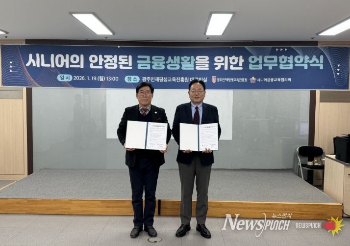 뉴스펀치 김용희 기자 | (재)광주인재평생교육진흥원(원장 송형길)은 (사)시니어금융교육협의회(사무총장 오영환)와 19일 시니어의 안정된 금융생활과 금융소비자 보호를 위한 업무협약을 체결했다.