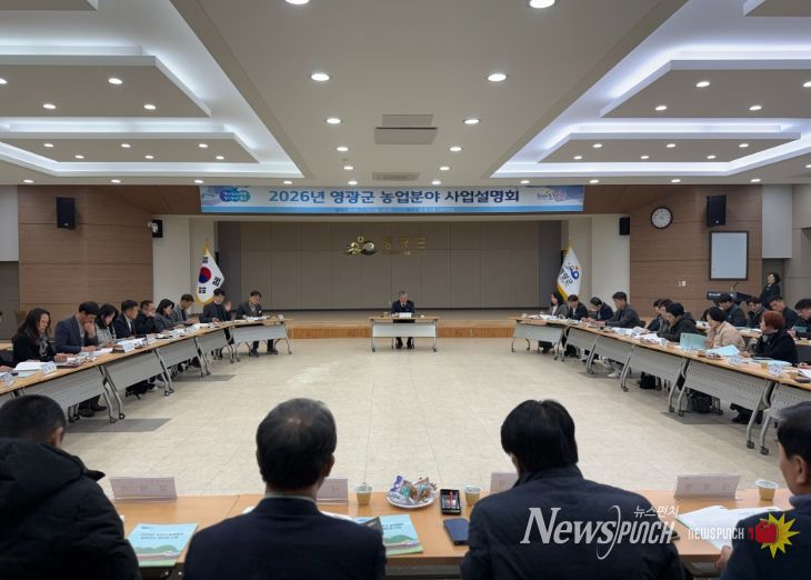 뉴스펀치 김용희 기자 | 영광군은 지난 19일 농업현장에서 농업인들과 직접 소통하는 읍·면, 농·축협 및 농업관련단체 등 60여 명이 참석한 가운데, 농업분야 정책과 각종 지원사업에 대한 이해를 돕기 위해 '2026년도 농업분야 사업설명회'를 개최했다.