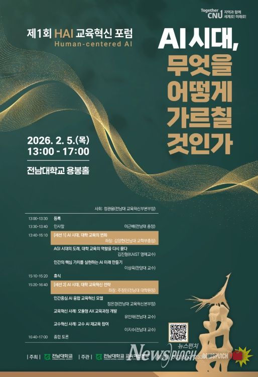 뉴스펀치 김용희 기자 | 전남대학교가 오는 2월 5일 오후 1시 전남대 국제회의동 용봉홀에서 ‘제1회 HAI(Human-centered AI) 교육혁신 포럼’을 개최하고, AI 시대에 대응하는 대학 교육의 새로운 이정표를 제시한다.