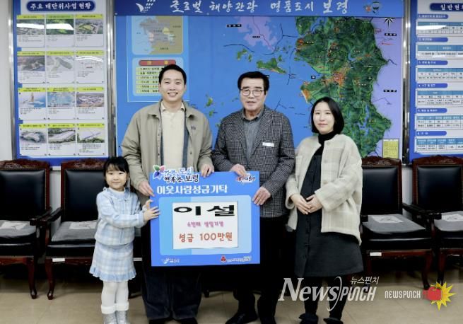 뉴스펀치 이현승 기자 | 보령시는 지난 20일 시장실에서 이지원 씨와 배우자 고가슬 씨, 그리고 딸 이설 양이 참석한 가운데 ‘희망 나눔 캠페인’ 성금 전달식을 가졌다. 이날 이 씨 가족은 이설 양의 생일을 기념해 정성껏 마련한 성금 100만 원을 보령시에 기탁했다.