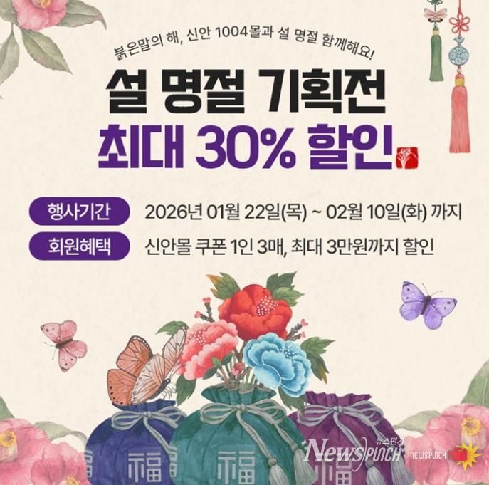뉴스펀치 김용희 기자 | 신안군은 다가오는 설 명절을 맞아 지역 농어가와 소상공인 판로 확대를 위해 온라인 쇼핑몰 ‘신안1004몰)’에서 1월 22일부터 2월 10일까지 설 명절 특별 기획전을 진행한다.