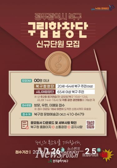 뉴스펀치 김용희 기자 | 광주광역시 북구가 아름다운 목소리로 주민들과 소통하는 구립합창단 신규 단원을 모집한다고 21일 밝혔다.