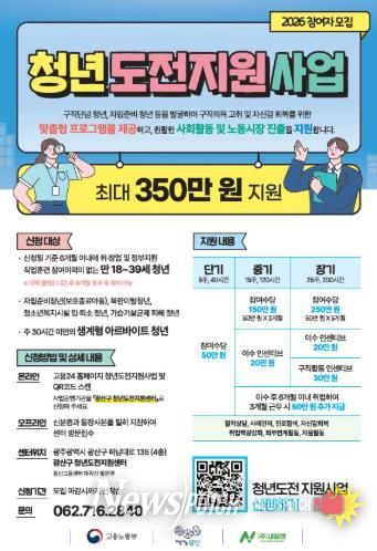 뉴스펀치 김용희 기자 | 광주 광산구는 고용노동부가 주관하는 ‘청년도전지원사업’ 참여자를 모집한다고 밝혔다.