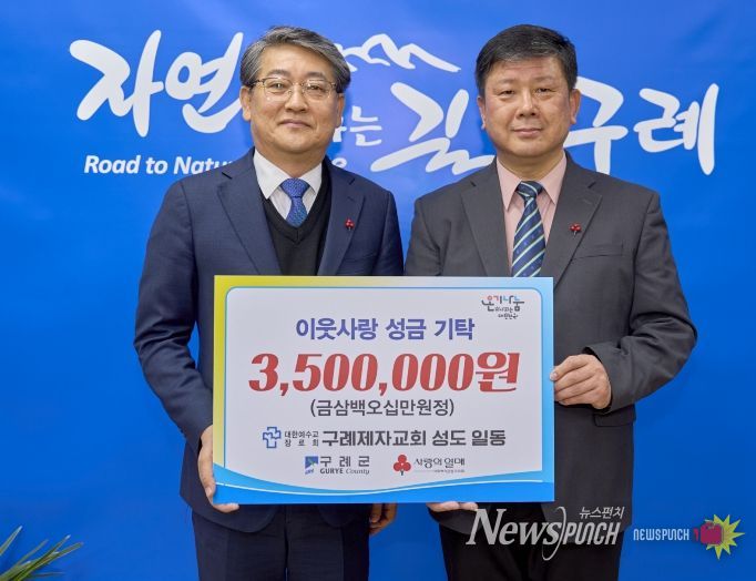뉴스펀치 김용희 기자 | 구례군은 12월 21일 대한예수교 장로회 구례제자교회(담임목사 김도형)가 희망2026나눔캠페인에 동참하며 연말연시 어려운 이웃을 위해 성금 350만 원을 기탁하는 전달식을 가졌다고 밝혔다.