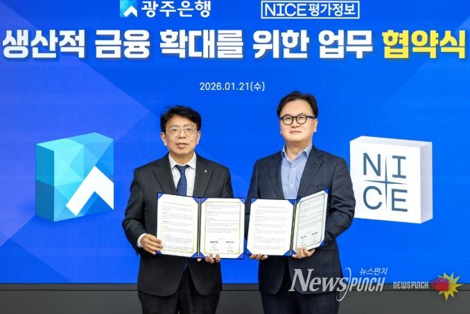 뉴스펀치 김용희 기자 | 광주은행은 21일, 광주은행 본점에서 NICE평가정보㈜와 지역 산업 경쟁력 강화를 위한 ESG 데이터 기반 ‘생산적 금융 확대 업무협약(MOU)’을 체결했다고 밝혔다.