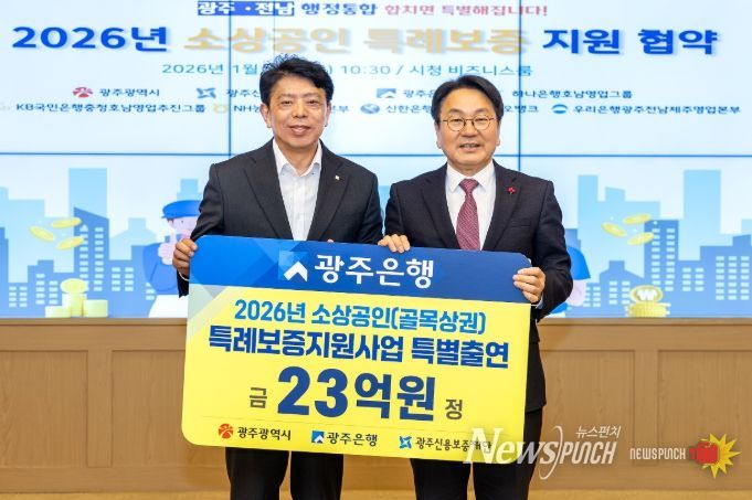 뉴스펀치 김용희 기자 | 광주은행은 22일 광주광역시청에서 강기정 광주광역시장, 정일선 광주은행장, 염규송 광주신용보증재단 이사장 및 관계자가 참석한 가운데 ‘2026년 소상공인 특례보증 대출 지원사업 협약’을 체결했다고 밝혔다.