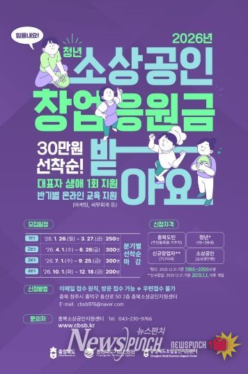 뉴스펀치 이현승 기자 | 충북도와 (재)충청북도기업진흥원(소상공인지원센터)이 ‘2026년 청년 소상공인 창업응원금 지원사업’의 1분기 참여자 250명을 1월 26일부터 오는 3월 27일까지 선착순으로 모집한다.