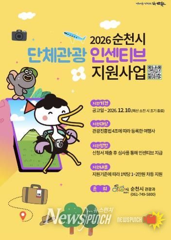 뉴스펀치 김용희 기자 | 순천시는 지역 경제에 활력을 불어놓고 ‘순천형 치유관광’자원의 가치를 널리 알리기 위해 ‘2026년 단체관광객 유치 인센티브 지원사업’을 추진한다고 밝혔다.